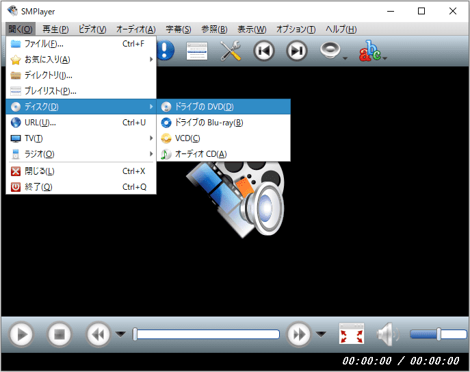 - SMPlayerを起動し、「開く」>「ディスク」>「ドライブのDVD」をクリックします。