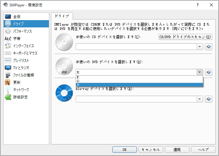 - そしてSMPlayerの設定画面に戻り、「お使いのDVDデバイスを選択します」でDVDデバイスを「H」に設定して、「OK」をクリックします。