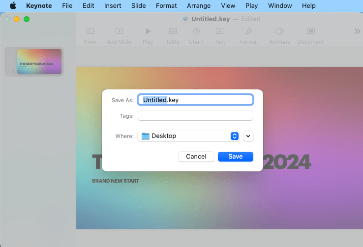 ファイルを保存しなくても、Keynoteはそのファイルを自動的に保存し、「名称未設定」と名付けるかもしれません。そのファイルには必ずしもすべての内容が保存されているわけではありませんが、ほとんどの内容はあるはずです。