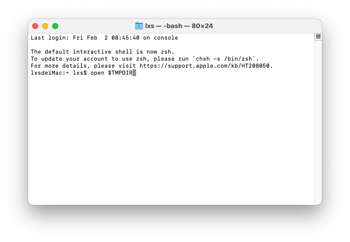 - 「open $TMPDIR」を入力して、Enterキーを押します。
