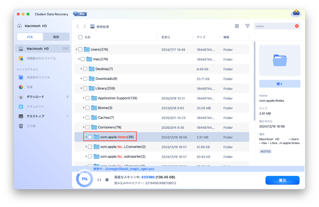 まずは検索ボックスに「notes」を入力して検索します。消えたメモのデータは「com.apple.Notes」フォルダの「Data」にあります。