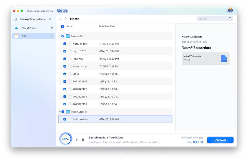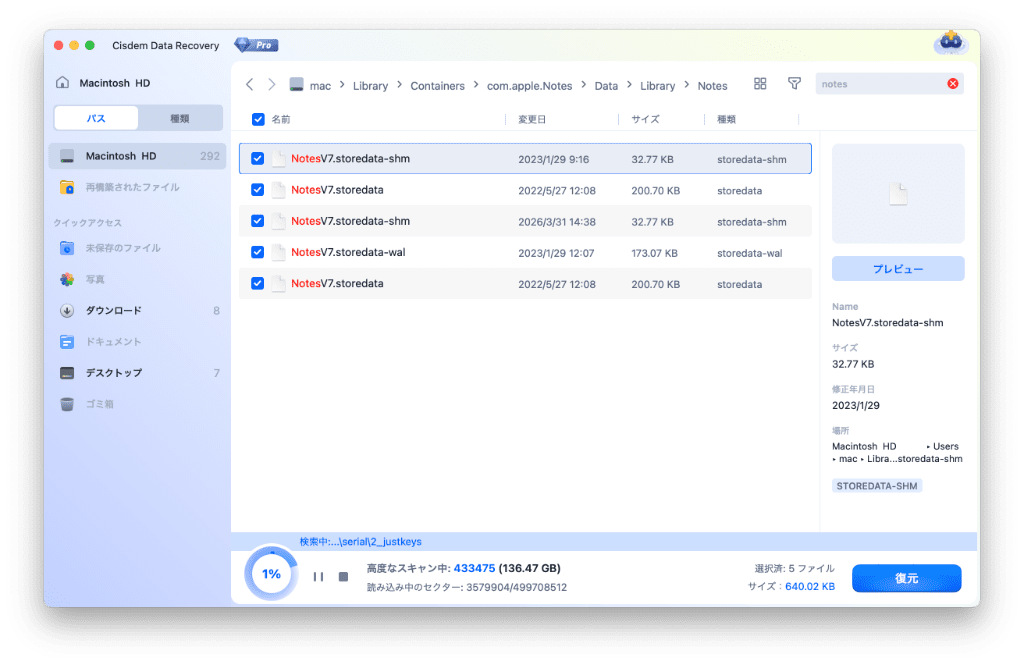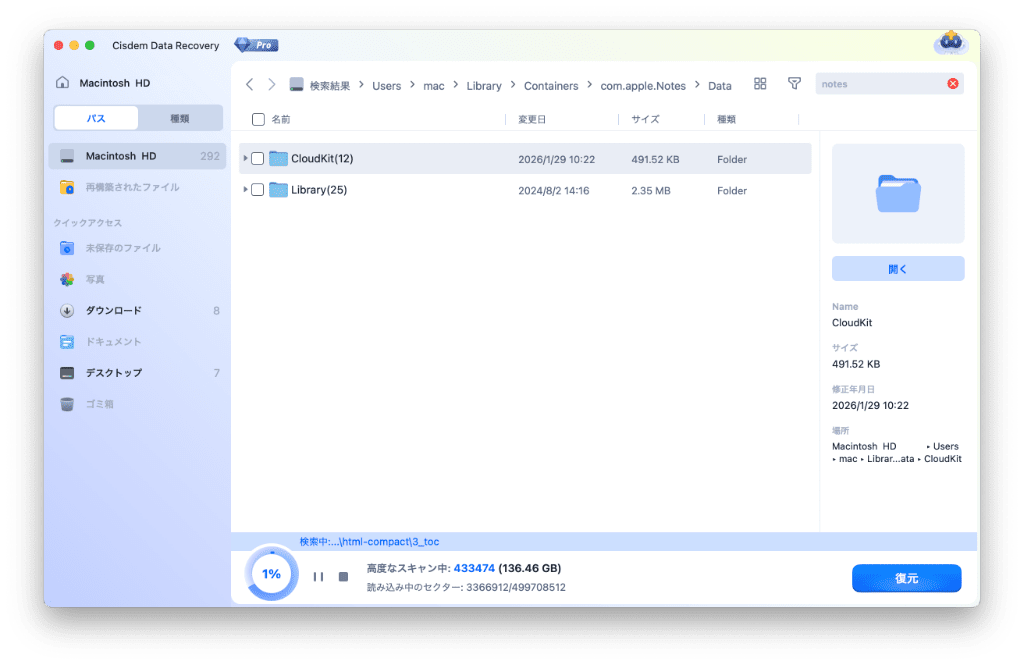 Cisdem Data Recoveryはデータ復元ソフトで、Macの内蔵HDDや外付けHDD、USBメモリ、SDカード、デジタルカメラ、iPodsなどから削除された/消えた/破損したファイルを復元できます。また、iCloudアカウントの消えたメモにも対応できます。Cisdem Data Recoveryを使えば、以前のメモのデータファイルを見つけて、消えたメモを復元できます。
