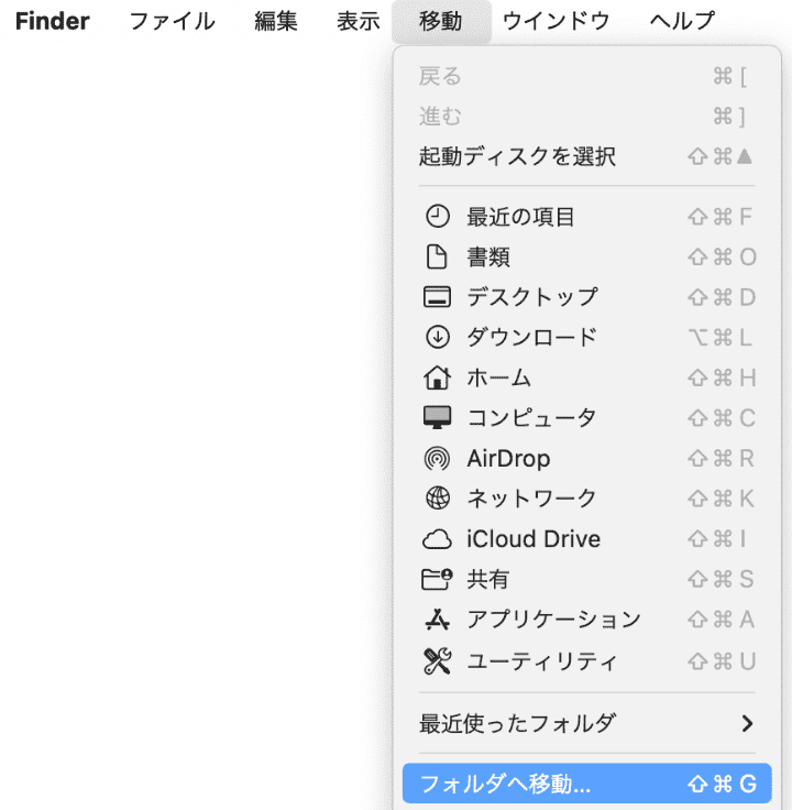- Finderを開き、「移動」>「フォルダへ移動」をクリックします。