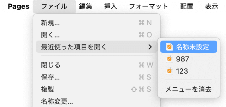 Pagesの内蔵機能--「最近使った項目を開く」機能を使うのも一つの方法です。未保存のPagesファイルを復元できるかもしれません。