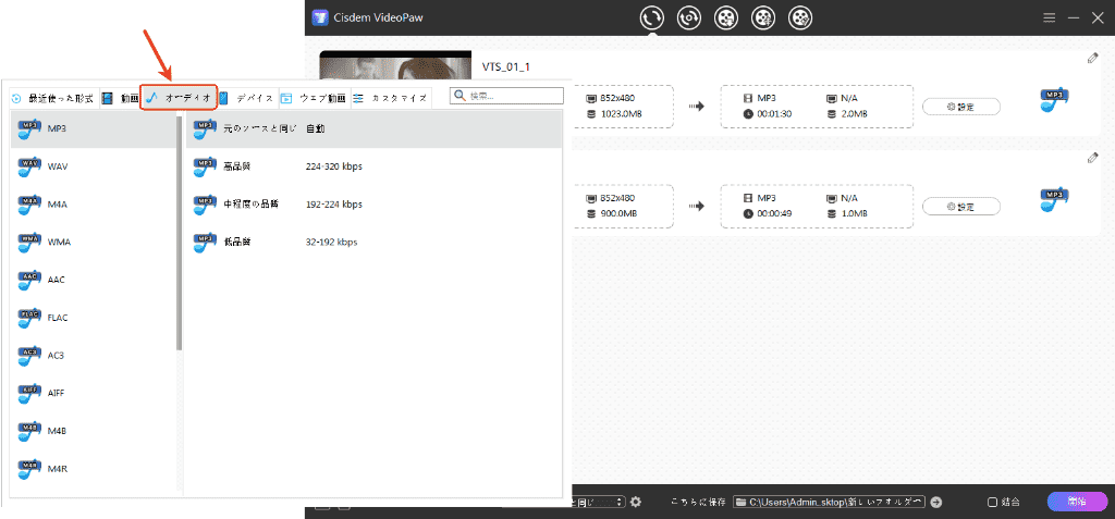 複数のタイトルを一つのファイルにマージして出力したい場合は、右下の「結合」機能を有効にしましょう。
