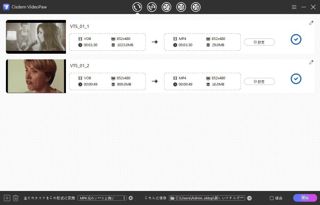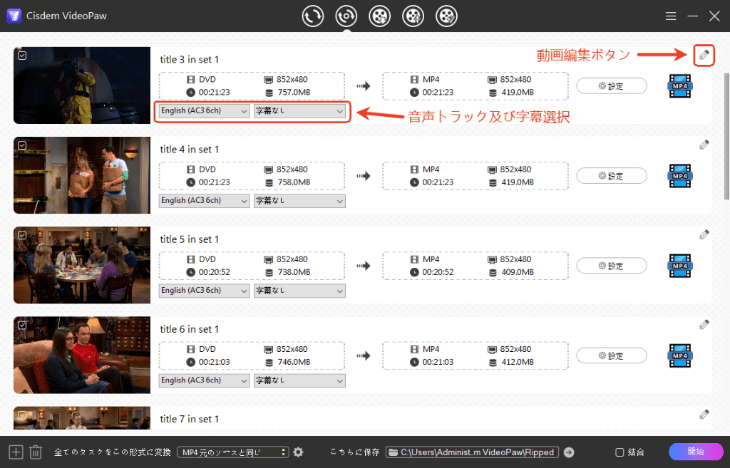 すべて設定完了しましたら、画面右下隅の開始ボタン(Mac版の場合は「変換」)をクリックして、DVDリッピングし始めます。リッピング完了後、