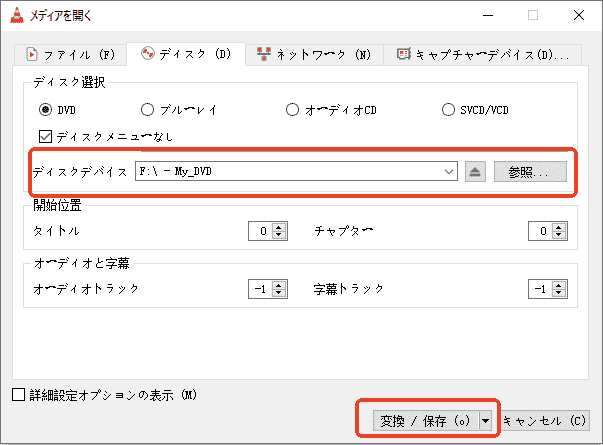 8.上記の手順に沿って、もう一度「ディスク」タブに入ります。「開始位置」の「タイトル」のところを「2」と設定して、「変換/保存」をクリックします。