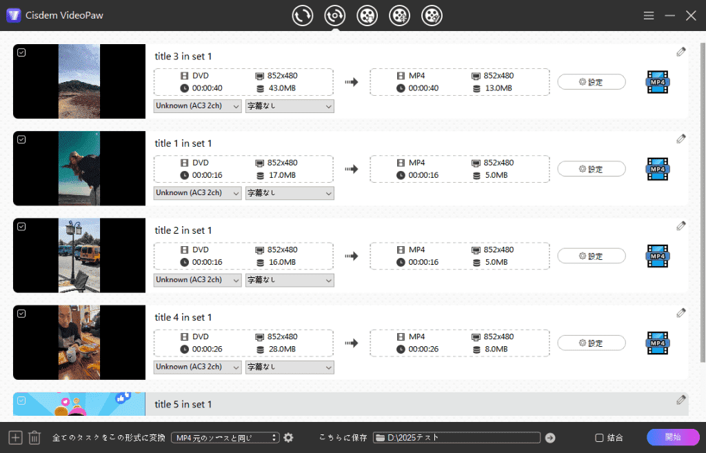 9.上記と同じ手順で出力形式とファイル名を設定し、変換を開始します。これで2つ目のタイトルがMP4に変換されます。