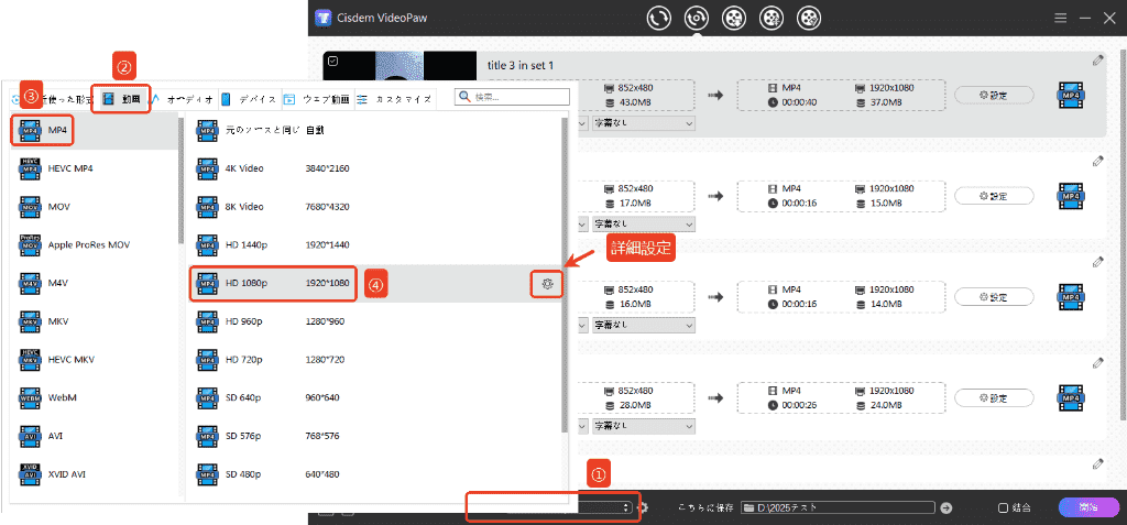 3. 出力形式を「MP4」と設定します。解像度なども設定できます。