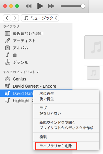 - 同じプレイリストを右クリックして、「ライブラリから削除」をクリックします。