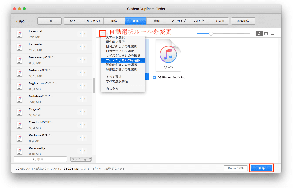 初期設定では、自動選択機能によりiTunesの重複ファイルが自動的に選択されます。自動選択ルールを変更し、さらに手動で選択または選択解除ができます。