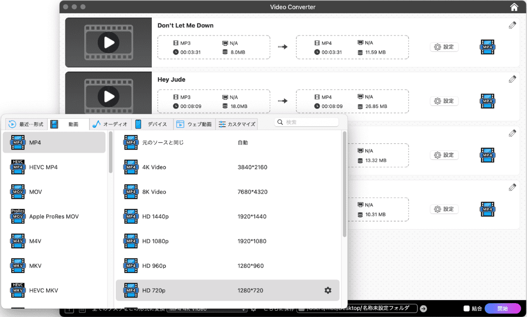 ステップ 4. 右下隅の「変換」ボタン(Windows版の場合は「開始」)をクリックして全てのMP3を一括でMP4に変換します。必要な場合は隣の「結合」機能を有効にして、全てのMP3を1つのMP4ファイルに結合して出力できます。