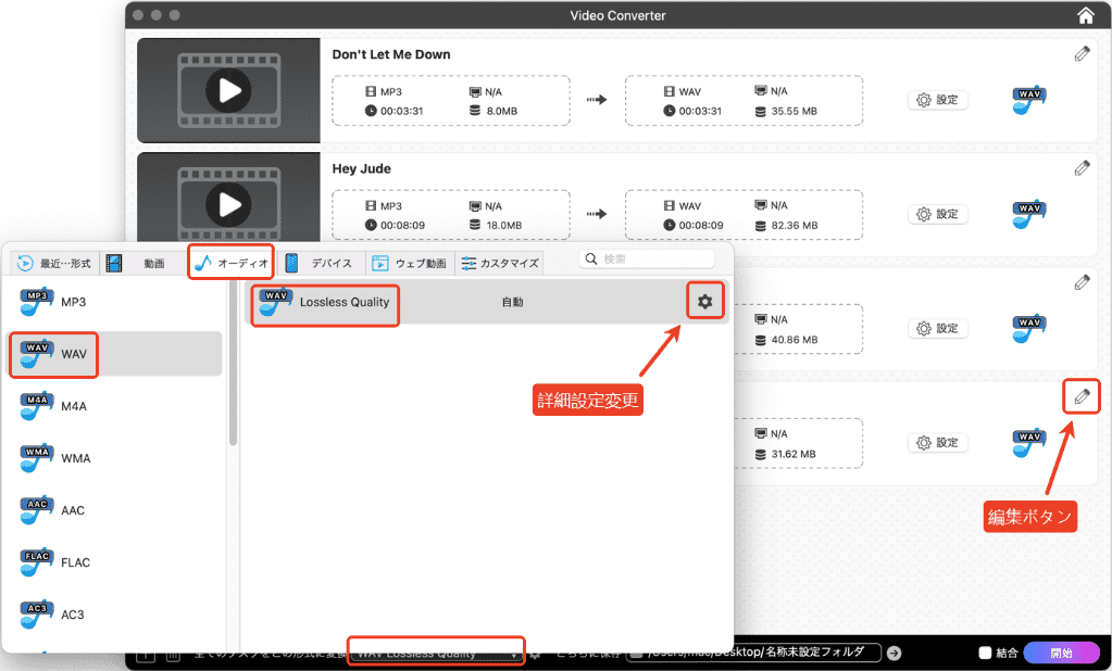 - 最後に右下の「変換」ボタン(Windows版の場合は「開始」)を押せばMP3をWAVに変換できます。開始ボタンの左にある「結合」機能を有効にすれば、複数のMP3を1つのWAVに結合できます。