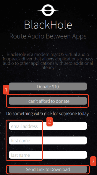 2. 料金を支払いたくない場合は「I can't afford to donate」をクリックします。そして表示された3つのテキストボックスにメールアドレス、名前、苗字を入力します(偽名を使ってもOKです)。