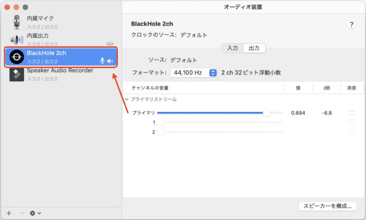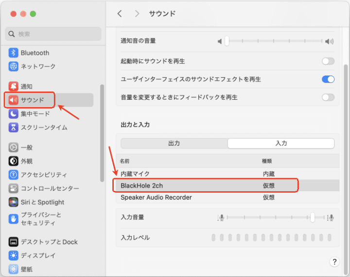 9. また、「システム設定」>「サウンド」>「出力と入力」にも「BlackHole 2ch」が表示されます。