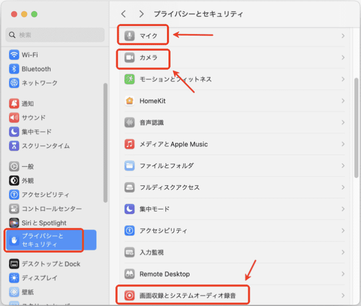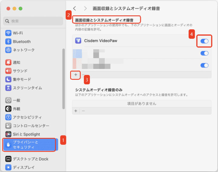 ※Cisdem VideoPawでMacの画面を録画するのに、「システム設定」>「プライバシーとセキュリティ」で「画面収録とシステムオーディオ録音」の権限を与える必要があります。