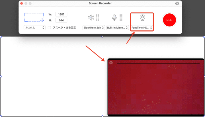 を有効にすると、Macの画面を録画すると同時にカメラ録画も可能です。カメラの録画は右下隅に表示されますが、位置調整ができます。