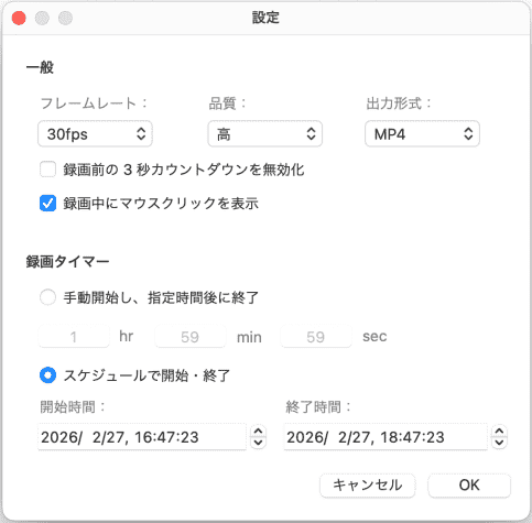 その他、「録画前に3秒カウントダウンを無効化」や「録画中にマウスクリックを表示」などのカスタマイズも可能です。