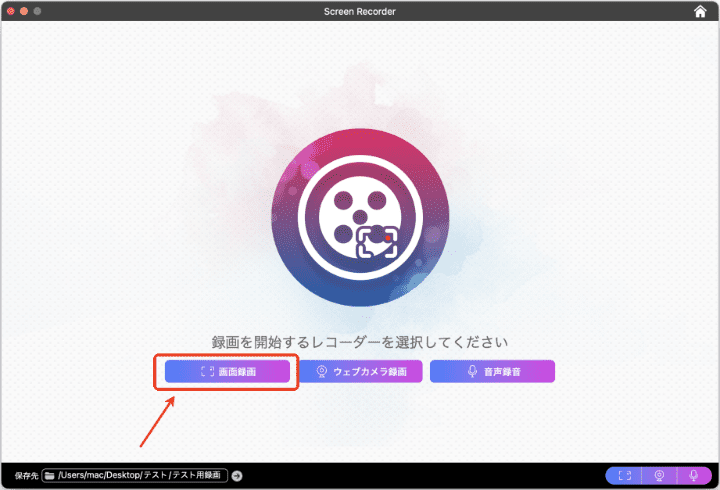 3. 「画面録画」をクリックして、Macの画面を録画します。カメラ録画も録音機能も搭載しています。
