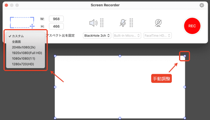 4. まずは録画範囲を指定します。手動で調整するか、直接「全画面」、「2048*1080」などを選択するのが可能です。