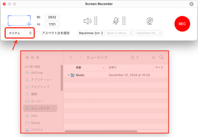 9. 設定完了後、「OK」をクリックして録画画面に戻ります。そして赤い「REC」ボタンをクリックして、Macの画面録画を始めます。
