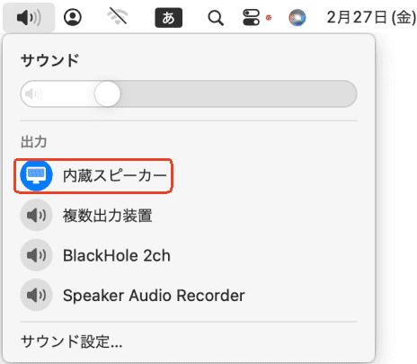 ②Macの内部音声と環境音を両方収録したい場合、上部のメニューバーの「サウンド」>「出力」(あるいは「システム設定」>「サウンド」>「出力」)で音声の出力方法を「内蔵スピーカー」に設定します。