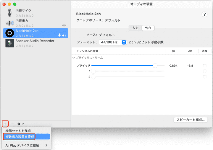 2. 左下隅の「+」をクリックして、「複数出力装置を作成」をクリックします。
