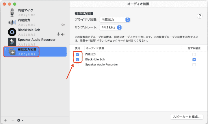 3. 「内蔵出力」と「BlackHole 2ch」にチェックを入れます。