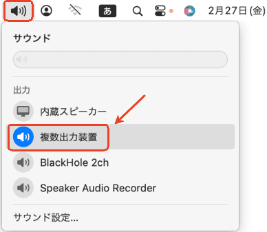 4. メニューバーでサウンドの出力方法を「複数出力装置」に設定します。