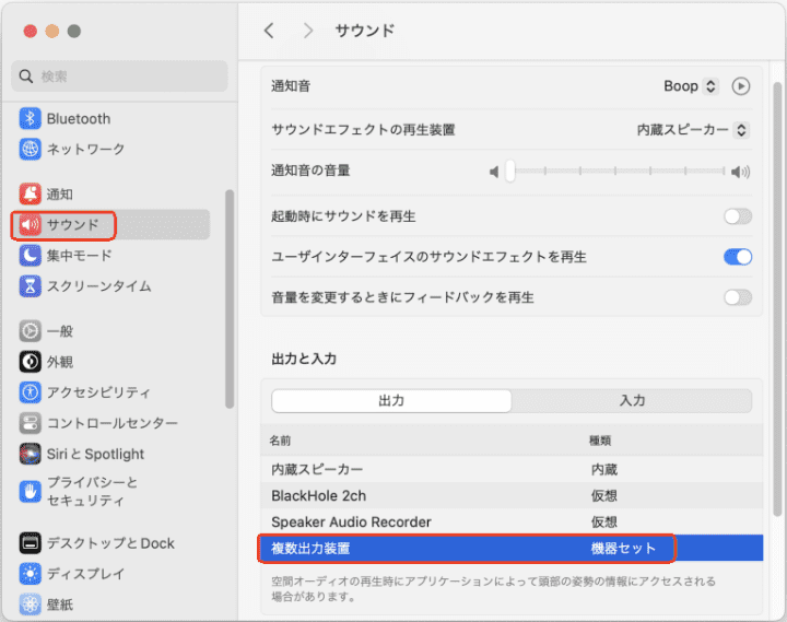 あるいは、「システム設定」>「サウンド」>「出力」で出力方法を「複数出力装置」に設定します。