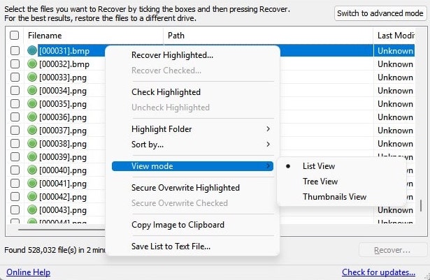 - 見つけたファイルの表示:3つの表示モードがあります(リスト、ツリー、サムネイル)。
