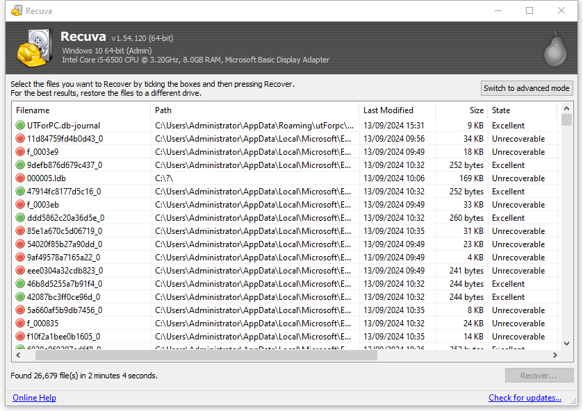 - スキャン完了後、見つけたファイルを並び替え、確認します。高度な設定に切り替えをクリックしてファイルをプレビューすることもできます。