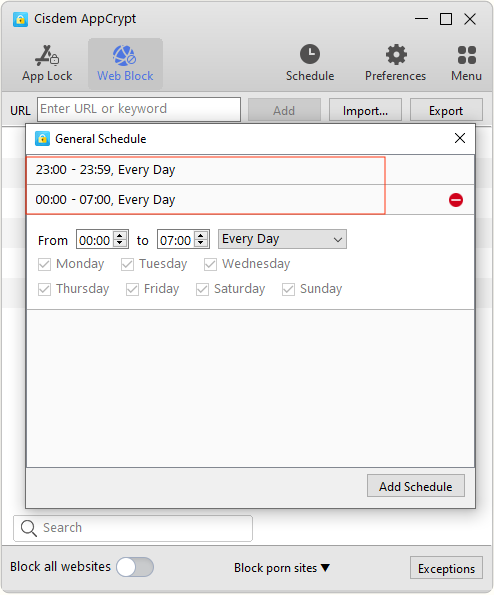 Tips: If you want to set a time period to block websites all night, you need to set up two schedules. For example, if you want to block websites from 23:00 to 7:00, you can set the schedules as the screenshot shown below.