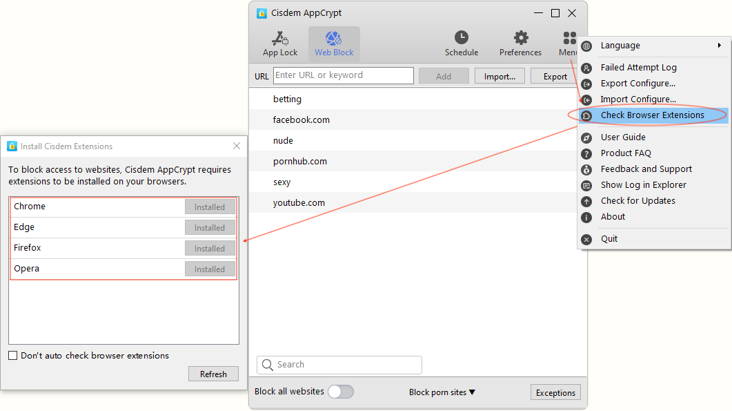 Cisdem AppCrypt for Windows supports 5 browsers: Chrome, Edge, Firefox, Brave and Opera. Cisdem AppCrypt requires extension Cisdem Web Block to block websites, so please confirm it has been installed on your browsers.