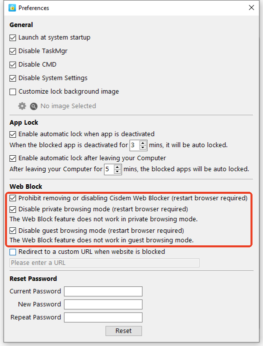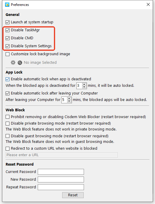 Technical guys can bypass Cisdem AppCrypt using Task Manager, CMD and System Settings. To enhance security, it is recommended to disable them. You can disable them in Preferences of Cisdem AppCrypt as the screenshot shown below