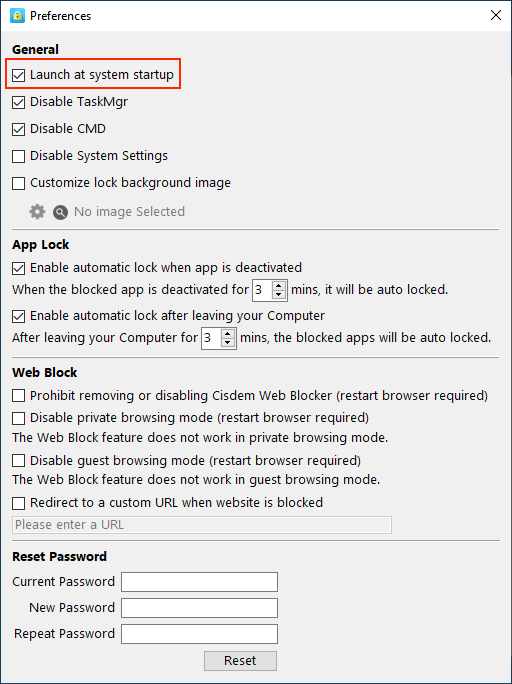 If you want continuous block from Cisdem AppCrypt, make sure Cisdem AppCrypt is running always even after restarting your computer. To enable the auto launch function, you can go to Preferneces of Cisdem AppCrypt, check on the option "Launch at systems startup"