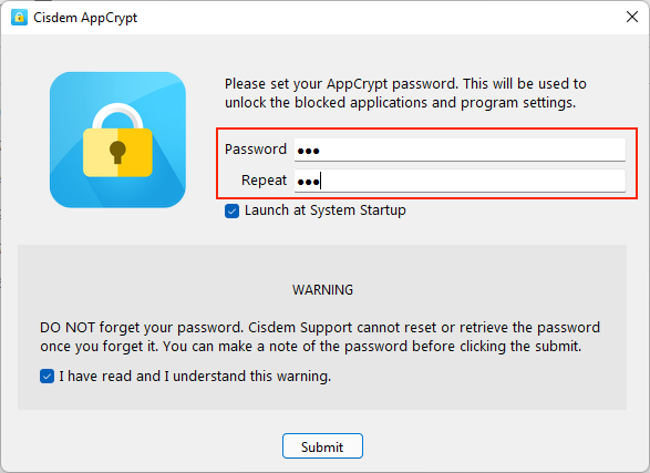 When you first launch Cisdem AppCrypt, you will be prompted to set a password. This password is used to unlock secured apps, go to the main window of Cisdem AppCrypt to change settings or quit Cisdem AppCrypt. It’s crucial that you choose a secure password, as it plays a key role in protecting your privacy and settings.