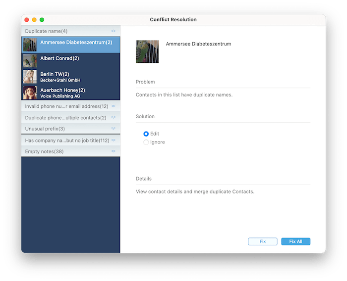 After the scan completes, unfold the conflict group “Duplicate name” on the left panel, choose Edit solution and click Fix All on the right side.