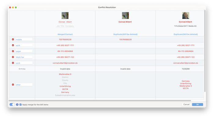 Please note that the merged contact is newly created, and the original duplicate name contacts will be removed to Trash. If you regret for deleting them, you can still put them back from Trash in ContactsMate.