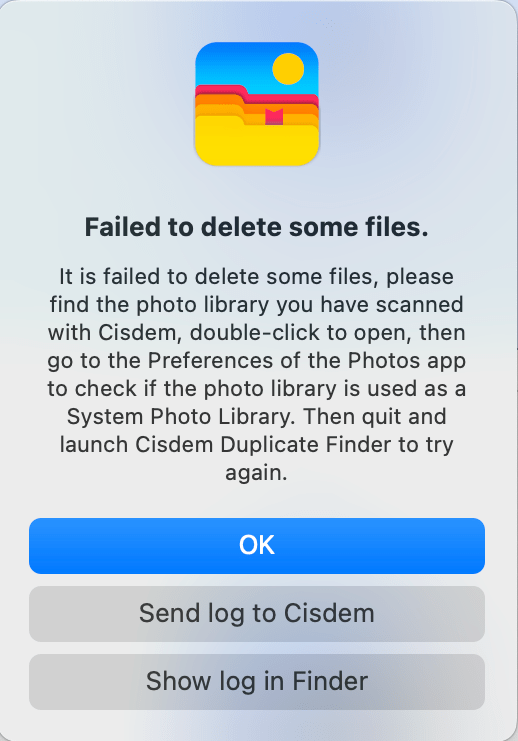Cisdem Duplicate Finder can only delete images from a photo library, you can locate the photo library according to the path that the log file refers, double click to open it, go to the Preferences of the Photos app, click "Use as System Photo library" to turn the button gray, and then try to delete again.
