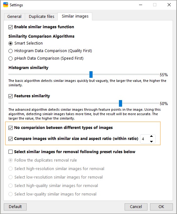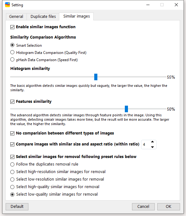 After understanding the above 3 algorthms, you will be able to choose a proper similarity comparison algorighm through the Similar images setting of Cisdem Duplicate Finder.