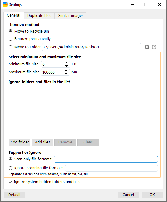 You can set the file size range that you want to scan for, if you want to scan for more duplicates, it is suggested to set a wide range.