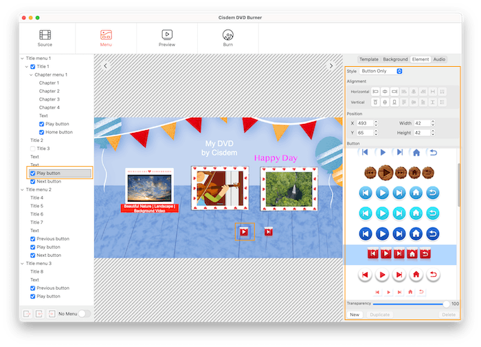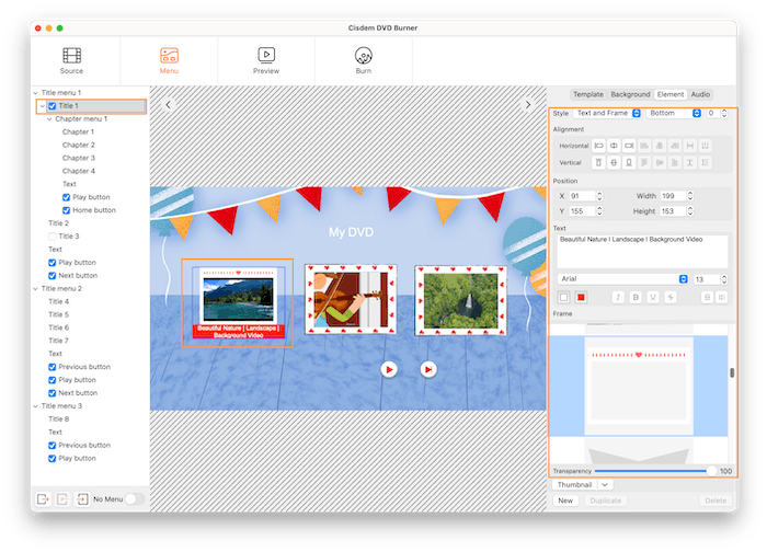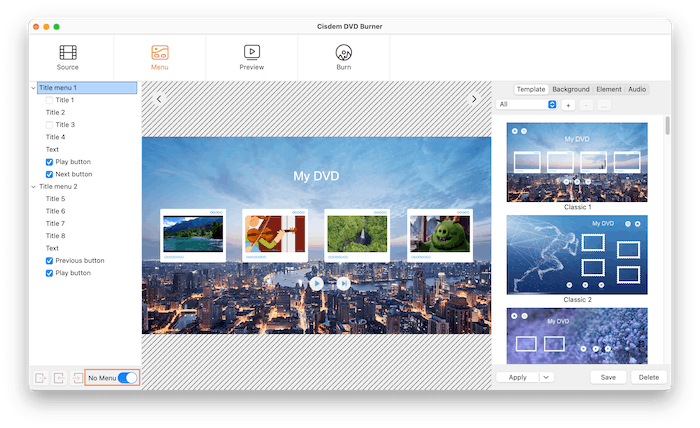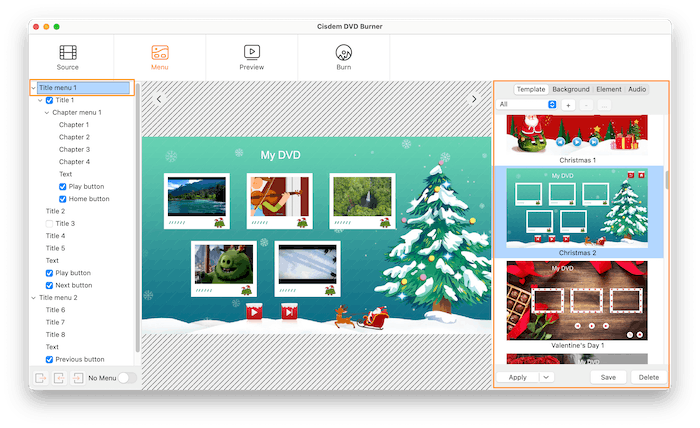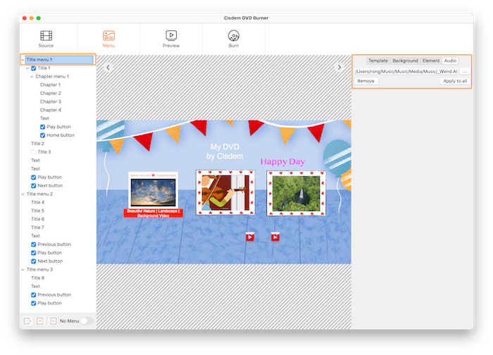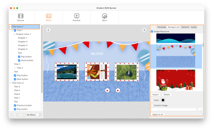 If you want to customize the DVD menu, you can just highlight the target Title menu/Title/Chapter Menu/Chapter, and then choose proper template, background, elements and audios on the right side.