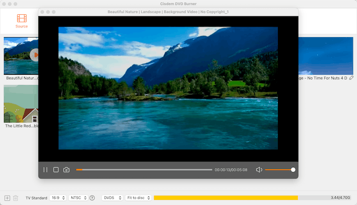 On the bottom of main interface you will see a progress bar which apprises you about the storage, you can choose the corresponding DVD type: DVD-5 or DVD-9. The difference between them is the storage, the former one can hold up as much as 4.7 gigabytes whereas the latter one can store data of up to 8.5 gigabytes. Also you can choose the TV Standard: 16:9 PAL/NTSC or 4:3 PAL/NTSC and code bitrate: Fit to disc, High quality and Standard, you are recommend to choose Fit to disc, so that Cisdem DVD Burner will provide you with an optimal solution.