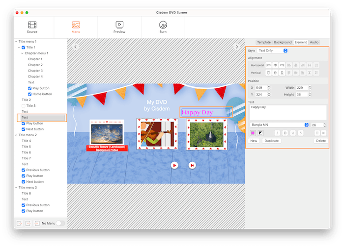 There are multiple elements in a menu, including text boxes, titles, buttons, etc. You can edit all of them under the Element tab.