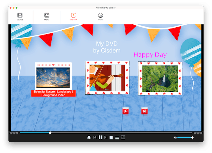 Once you completed editing the menu, you might want to preview the whole DVD, just to get a general idea of how it looks on TVs or computers. To do that, you need to navigate to Preview tab, the previewing will be automatically activated, you are allowed to control the playback using the playback bar below.