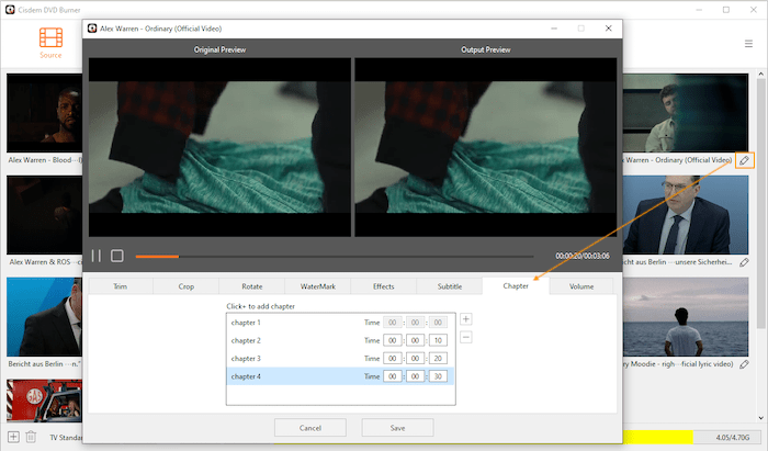 After adding videos into Cisdem Video Converter, click to get into the Edit window, choose Chapter, click + to add a chapter, enter the time interval for the added chapter. You can continue clicking + to add more chapters with the same method. Click Save when you are done.