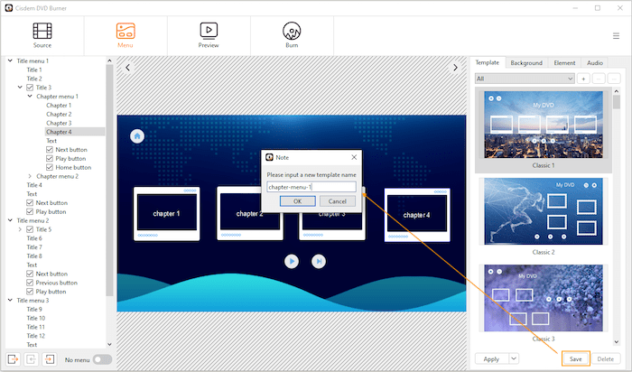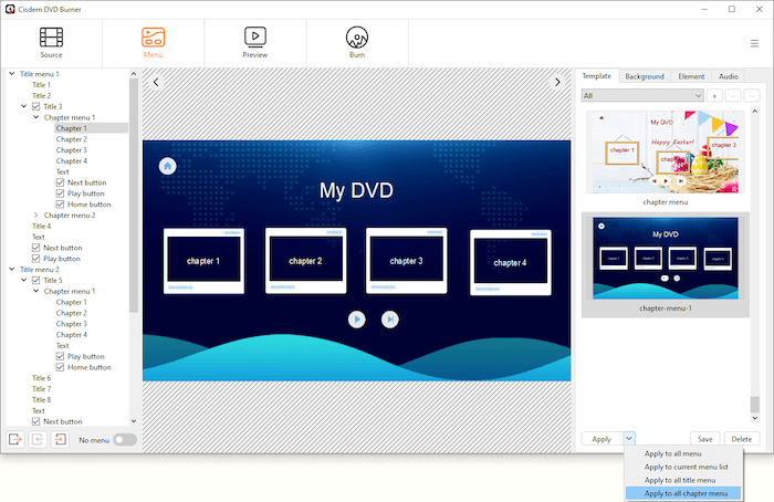 After finish editing one chapter menu, if you want to directly apply it to all the other menus, you can save it as a template. Double click the saved template in the template list, click the Apply button and choose to apply this template to the menus you need.