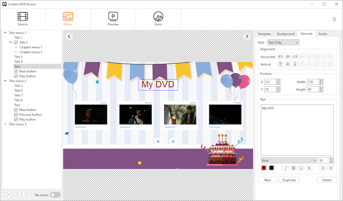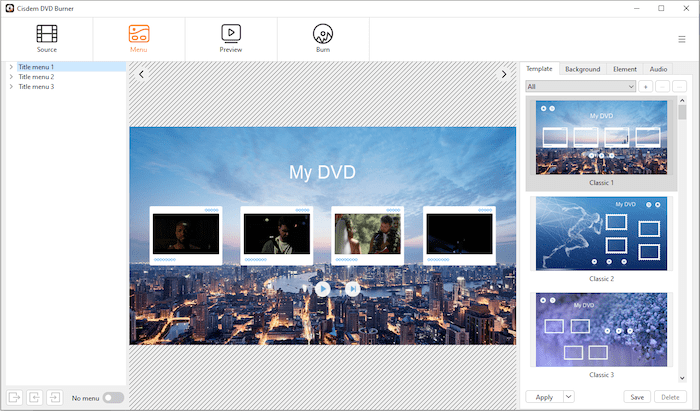 If you want to customize the DVD menu, you can just highlight the target Title menu/Title/Chapter Menu/Chapter, and then choose proper template, background, elements and audios on the right side.