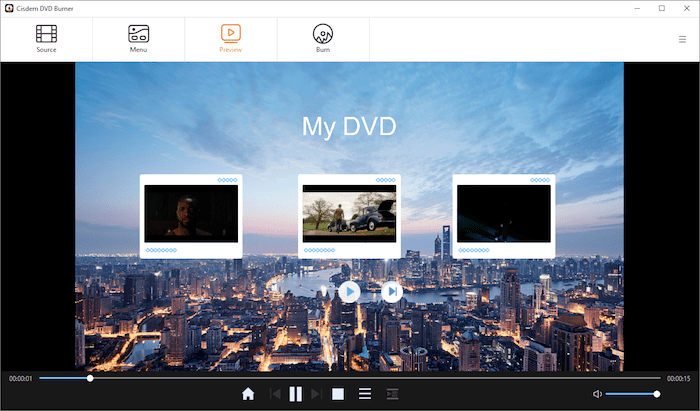 Once you completed editing the menu, you might want to preview the whole DVD, just to get a general idea of how it looks on TVs or computers. To do that, you need to navigate to Preview tab, the previewing will be automatically activated, you are allowed to control the playback using the playback bar below.